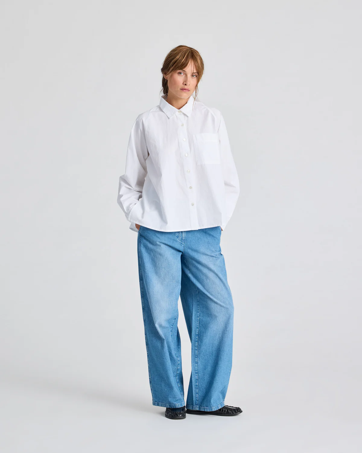 Bella is een shirt met lange mouwen, gemaakt van 100% biologisch katoenen popeline. Het shirt heeft raglanmouwen, een borstzak en knopen aan de voorkant en manchetten. Bella heeft plooien aan de achterkant, zijsplitten en een langere lengte aan de achterkant.