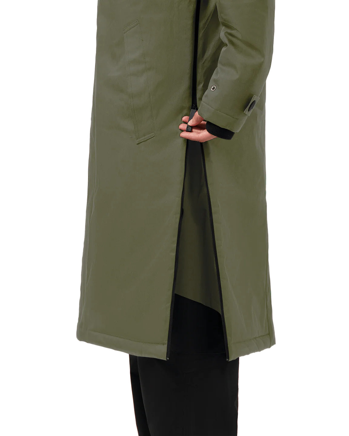 De Mac Padded voor dames is een volledig waterdichte regenjas designed for movement. Geïnspireerd op de traditionele Macintosh jas uit 1824, de eerste echte waterdichte regenjas, met een extra warme laag. Een klassiek silhouet met een moderne twist. Verandert gemakkelijk in een poncho voor fiets of e-scooter. Deze jas is gemaakt van 99 gerecyclede PET-flessen.