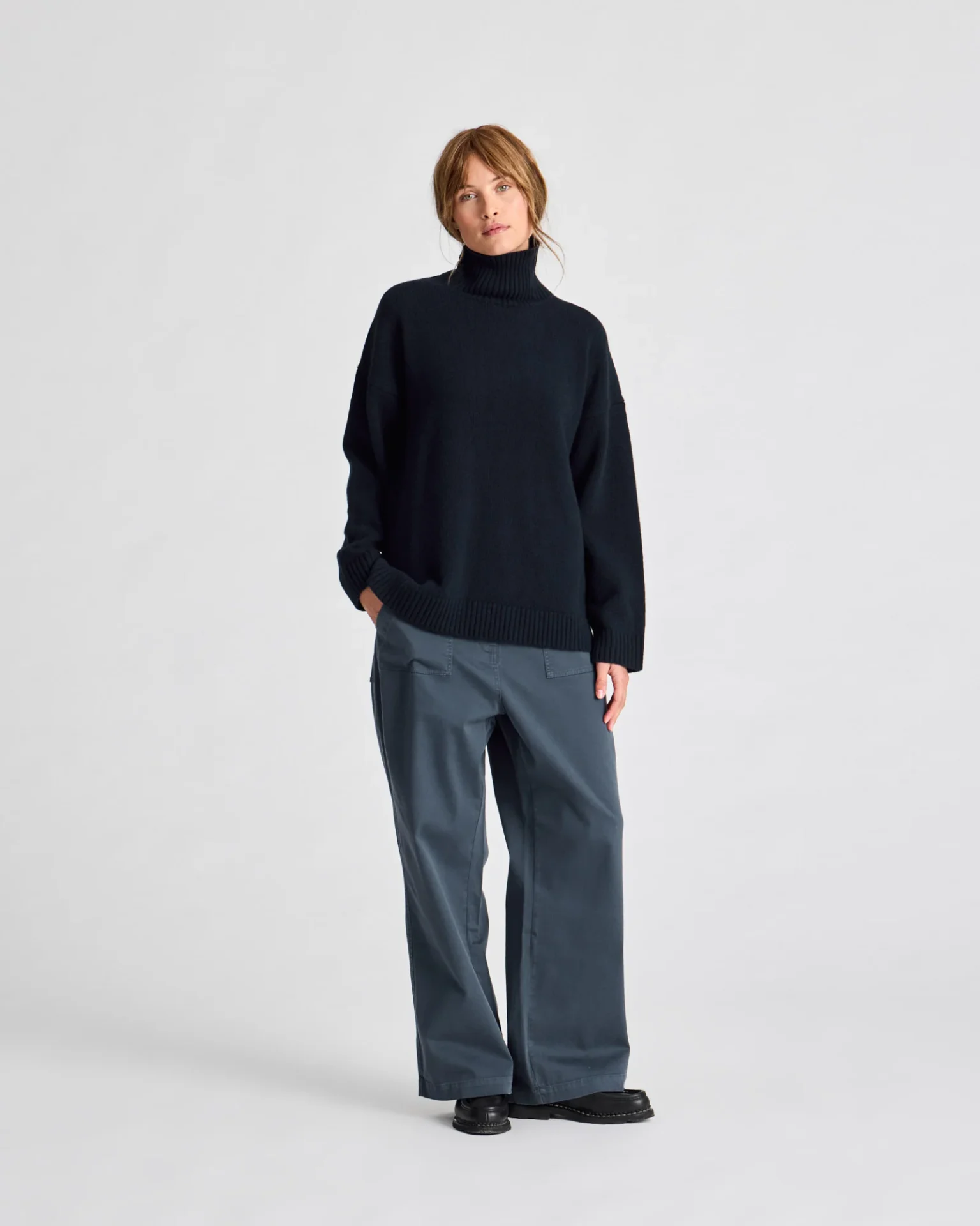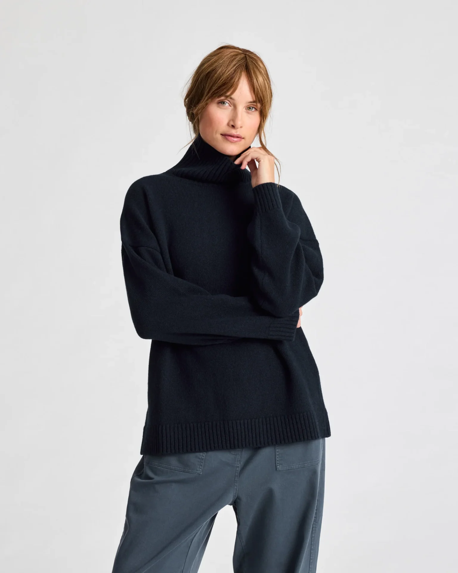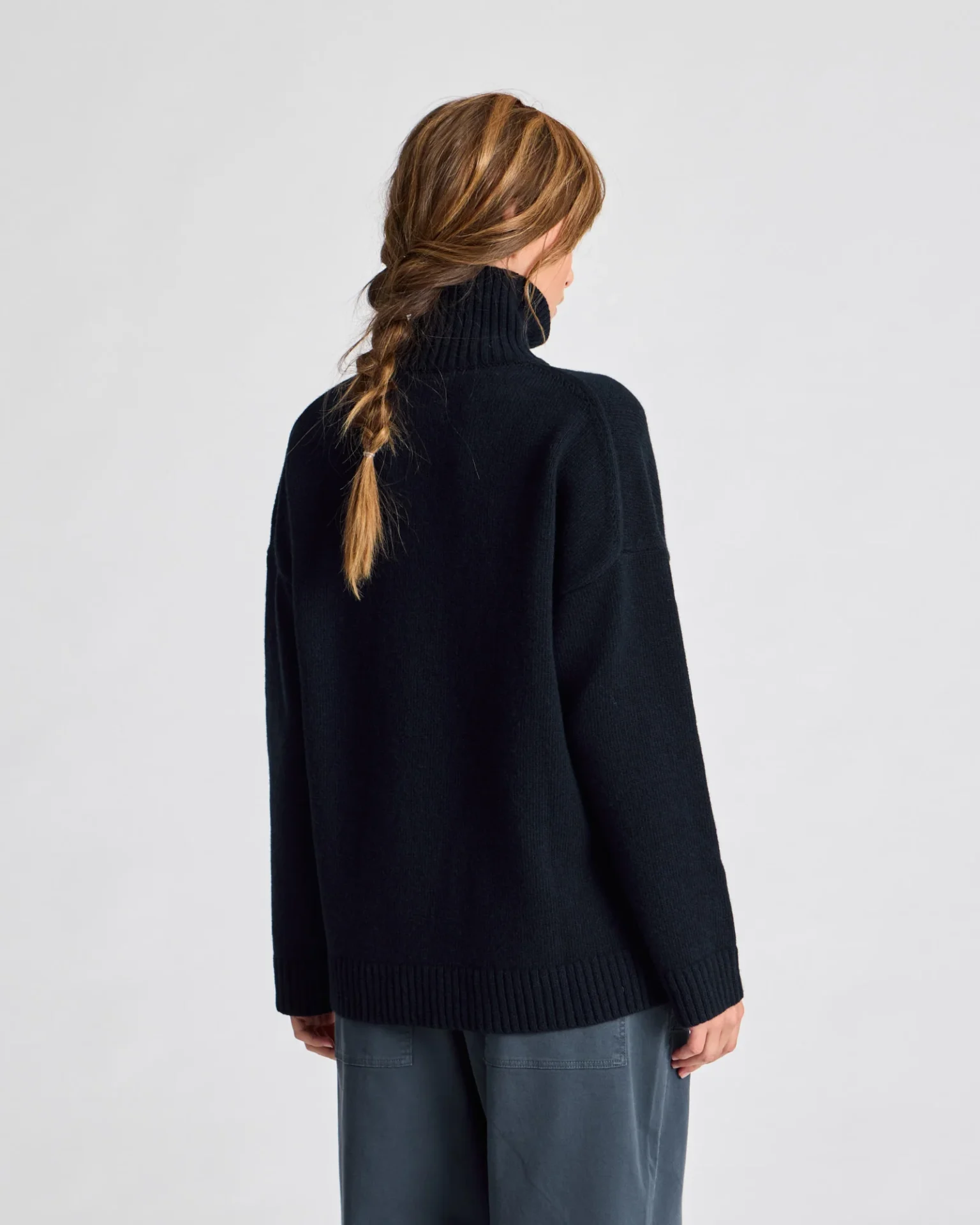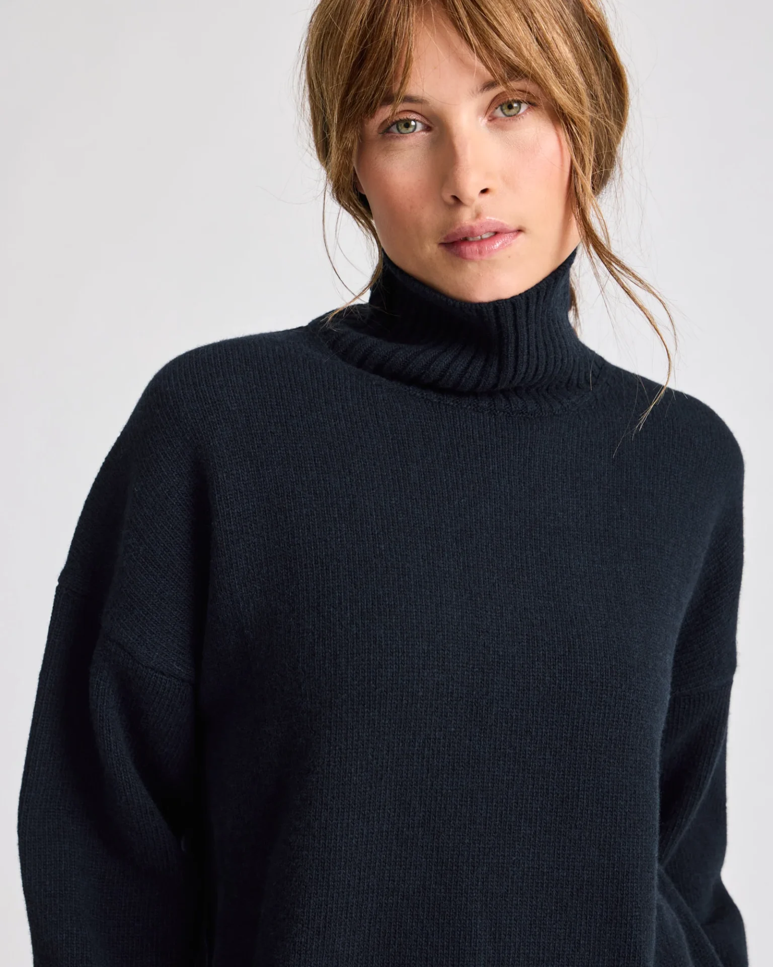Mandie is een coltrui breisel gemaakt van 100% lamswol. Het breisel heeft een relaxte pasvorm en verlaagde schouders. heeft geribbelde details op de mouwen en de onderkant.