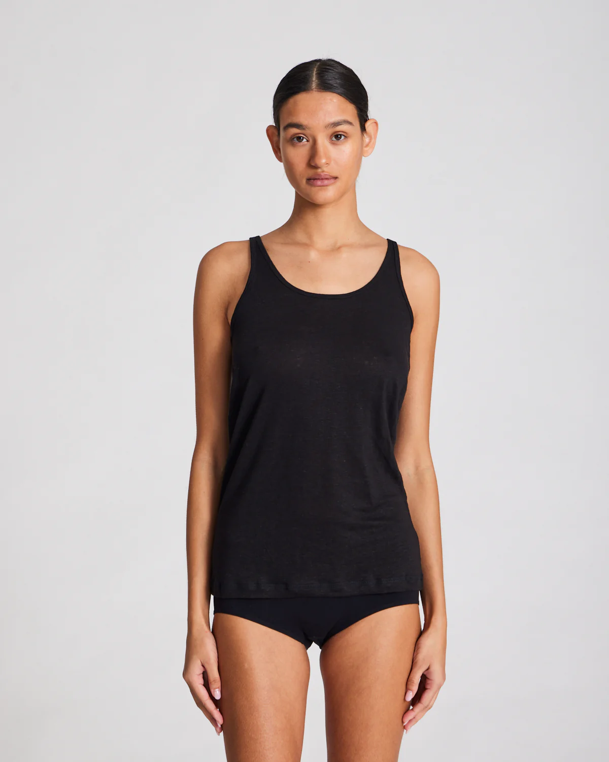Synne is een top gemaakt van 100% linnen. De top heeft smalle bandjes, een ronde halslijn en een losse pasvorm. De bovenkant is licht transparant in de lichte kleuren.