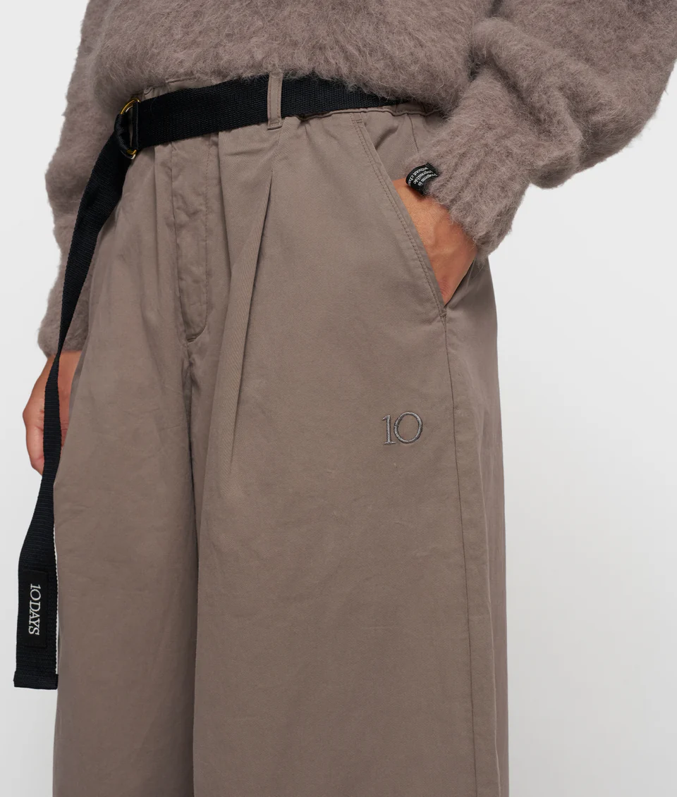 Oversized fit broek met wijde pijpen, gemaakt van GOTS-gecertificeerd biologisch katoenen twill. Voorzien van een elastische tailleband met ceintuur, schuine steekzakken en ’10’-monogram logo borduring onder de linker voorzak.