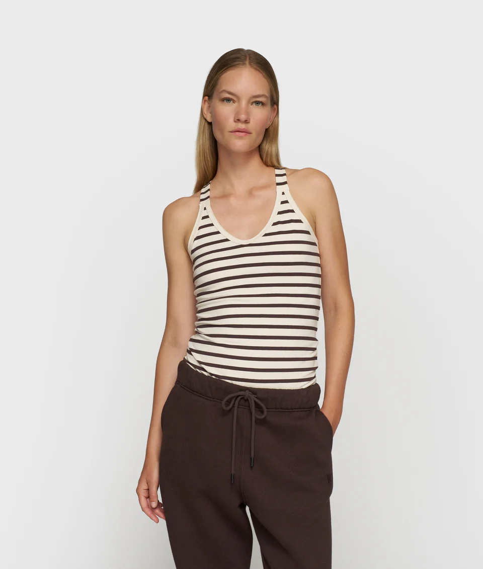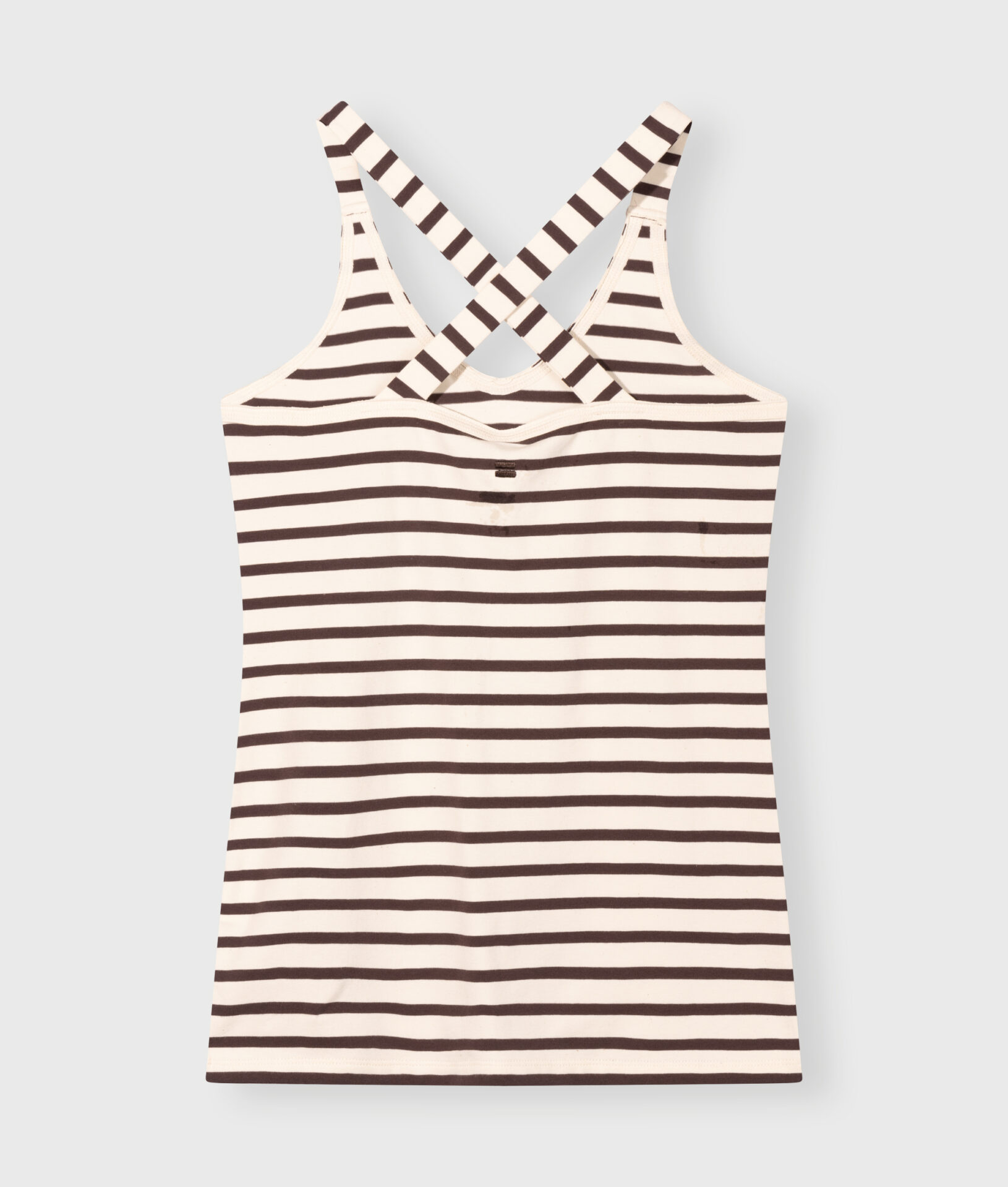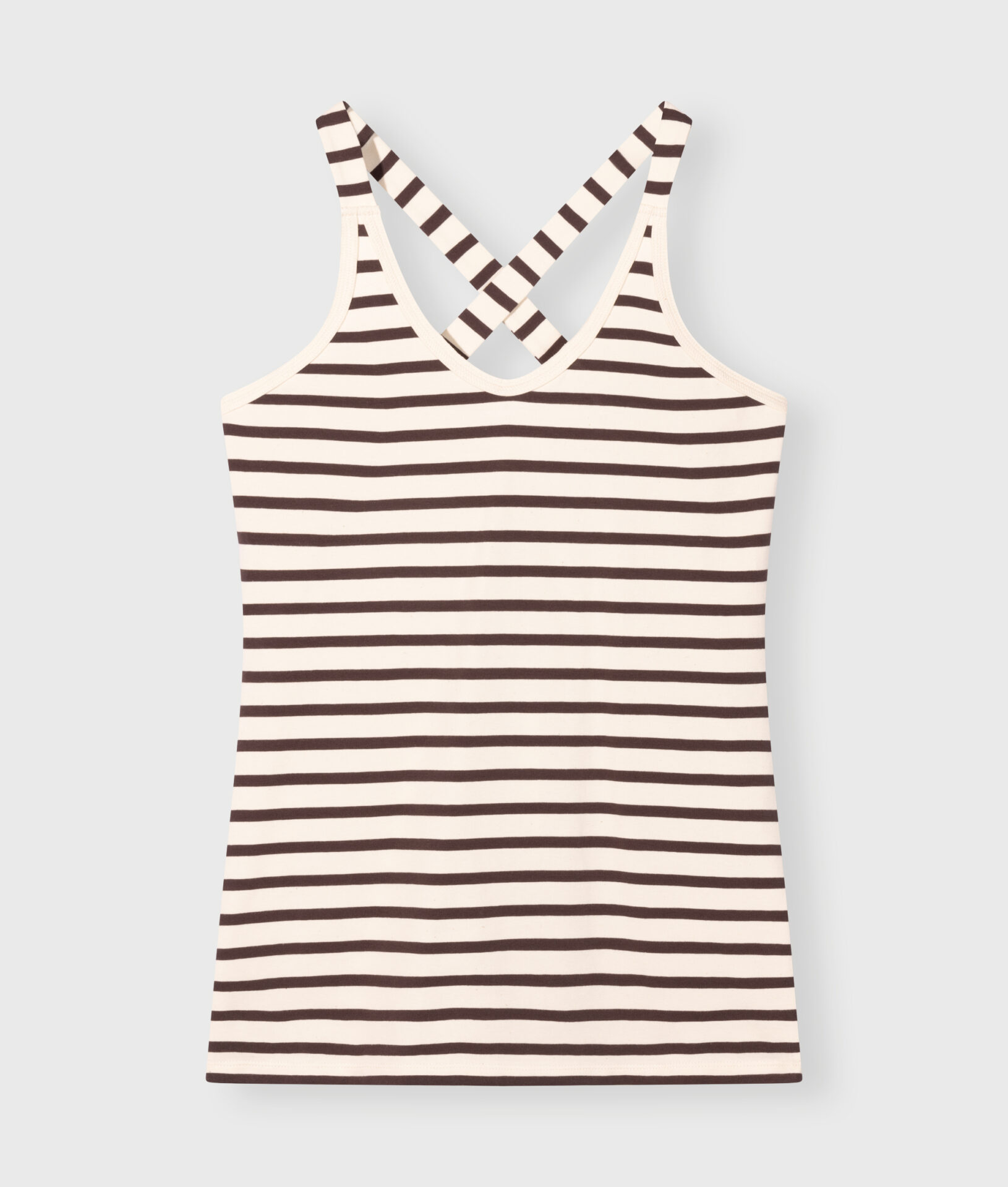 Slim fit singlet top met gekruiste bandjes achter, gemaakt met GOTS-gecertificeerd biologisch katoen. Voorzien van een vintage afwerking rond de hals en een mini stripes logo borduring op de rug.